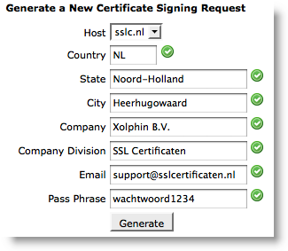 Voor het aanvragen van een SSL certificaat is een Certificate Signing Request (CSR) nodig. Genereer de CSR samen met de Private Key op de webserver. Vul voor een wildcard certificaat als CN (Common Name) een * (asterisk) in in plaats van het subdomein, bijvoorbeeld *.sslcertificaten.nl (en geen www.sslcertificaten.nl).